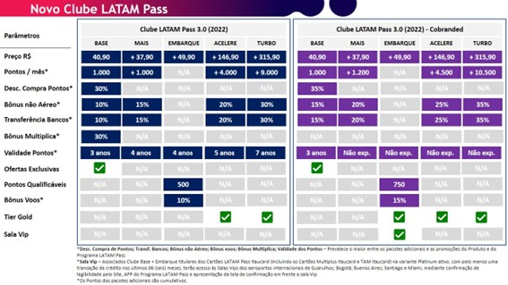 Os pacotes extras oferecem benefícios como desconto na compra de pontos, bônus em parceiros e transferências com bancos, além de pontos qualificáveis e maior validade dos pontos (de três a sete anos). Já o cliente com cartão co-branded LATAM Pass Itaú terá acesso a mais benefícios exclusivos no Novo Clube LATAM Pass, incluindo pontos que não expiram, acesso à Sala VIP e maior bônus em parceiros e em transferências com bancos.