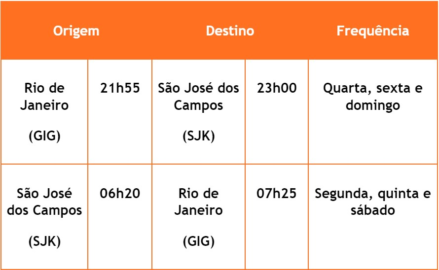 A partir de 27 de março, o voo inaugural G3 2116 deixará o RIOgaleão às 21h55, pousando em São José dos Campos às 23h00, sempre às quartas, sextas e domingos. Já o voo G3 2117 partirá do Vale do Paraíba (SP) às 6h20, aterrissando no Rio de Janeiro às 7h25, às segundas, quintas e sábados. As operações serão realizadas com as aeronaves Boeing 737 da GOL, com capacidade para até 186 passageiros.