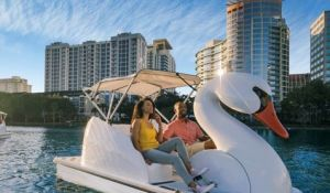 Quem já assistiu em um filme ou programa de TV um casal feliz desfrutando de um passeio de pedalinho a dois e já logo imaginou estar juntinho da pessoa amada em uma atração como esta? Na região central de Orlando, no Lago Eola Park, é possível alugar um pequeno barco em formato de cisne – os residentes mais emblemáticos do parque – e navegar curtindo o lindo cenário, enfeitado por uma icônica fonte.