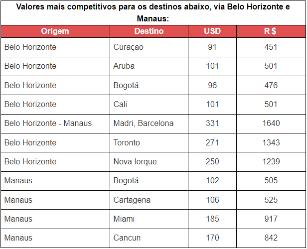 As ofertas mais atraentes são para quem está na capital mineira ou em Manaus, capital do Amazonas. Quem parte de Manaus e vai até Bogotá, por exemplo, paga apenas 505 reais por trecho. Mas há muitas outras opções de destinos para visitar partindo dessas localidades, todas com preços bem competitivos. Entre eles estão: San Salvador, Cancún, Aruba, Bogotá, Medellín, Cidade do México, Londres, Madri, Barcelona, Boston, Nova York e Miami.