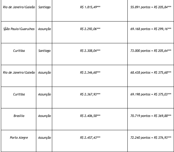 O cliente encontra tarifas especiais para voos entre Rio de Janeiro/Galeão e Santiago, a partir de R$ 1.815,49*** (preço de ida e volta com taxas inclusas) ou 55.891 pontos LATAM Pass + R$ 205,84***. A promoção também oferece ofertas para voos na rota São Paulo/Guarulhos-Assunção, a partir de R$ 2.292,06*** (preço de ida e volta com taxas inclusas) ou 69.168 pontos LATAM Pass + R$ 299,16***.