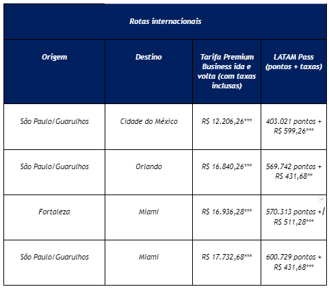 A promoção também reserva para os clientes ofertas na classe Premium Business de voos internacionais, que oferece assentos que reclinam até 180º, maior privacidade (acesso direto ao corredor na nova configuração de cabine das aeronaves Boeing 767, 777 e 787), manta e travesseiro, amenity kit, gastronomia premium e entretenimento a bordo. No aeroporto, a Premium Business também assegura um atendimento único desde o check-in até o desembarque e acesso exclusivo à Sala VIP LATAM. Confira abaixo algumas ofertas para destinos internacionais, em classe Premium Business: