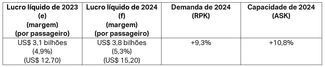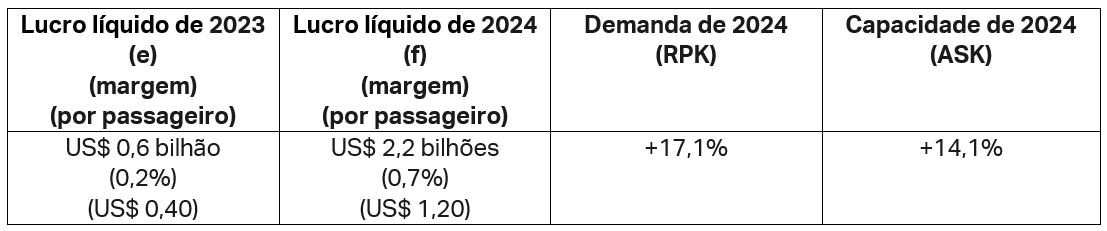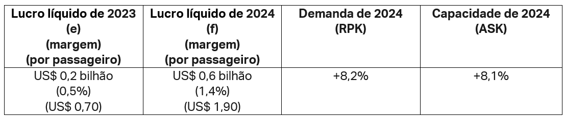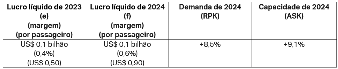 - A taxa de ocupação média de passageiros deve ser de 82,5% em 2024, em boa parte alinhada aos níveis pré-pandemia (82,6% em 2019) e reflete as condições sem folga de oferta e demanda dos problemas contínuos da cadeia de suprimentos de aeronaves e motores.