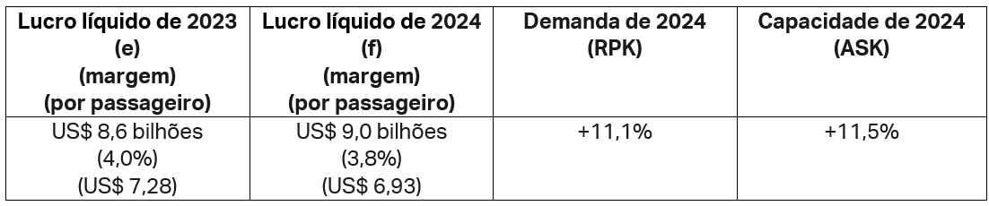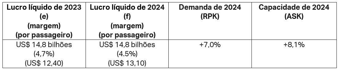 - Os lucros líquidos devem atingir US$ 30,5 bilhões em 2024 (margem de lucro líquido de 3,1%). Isso representará uma melhoria em relação aos lucros líquidos de 2023, estimados em US$ 27,4 bilhões (margem de lucro líquido de 3,0%). É também uma melhoria em relação à previsão de lucros de 2024 de US$ 25,7 bilhões (margem de lucro líquido de 2,7%) que a IATA divulgou em dezembro de 2023.