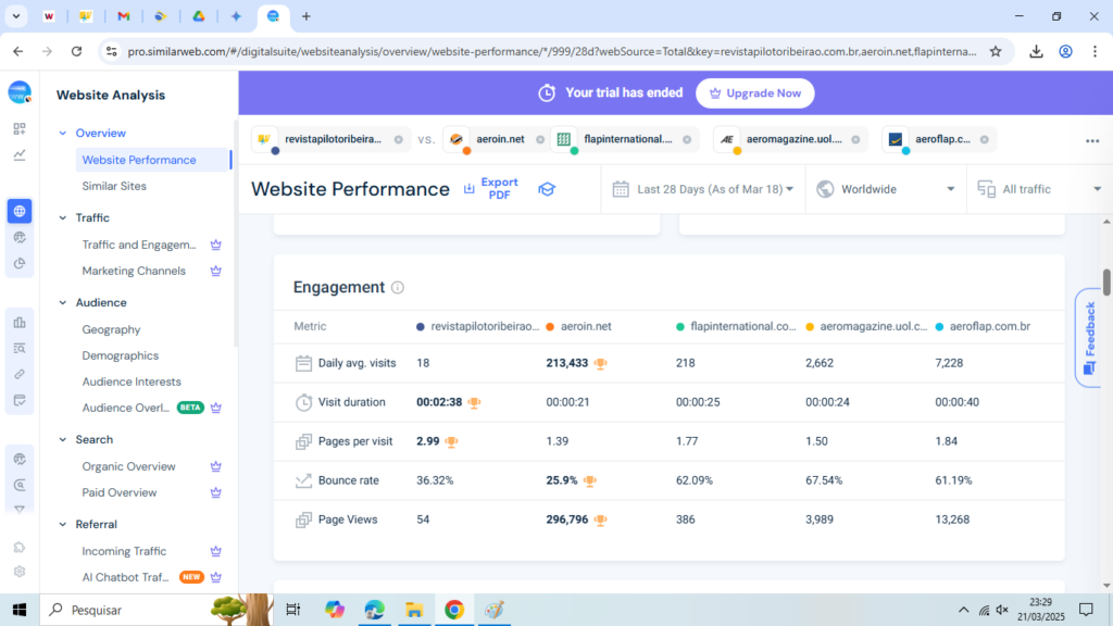 A Revista Piloto Ribeirão acaba de alcançar um feito histórico que a coloca em um patamar ainda mais elevado no cenário da aviação e do turismo no Brasil. De acordo com os dados mais recentes do SimilarWeb, o site da revista ultrapassou a marca de 2.99 páginas visitadas por sessão, um número que não apenas demonstra o crescente interesse do público, mas também consolida a liderança da publicação no setor.