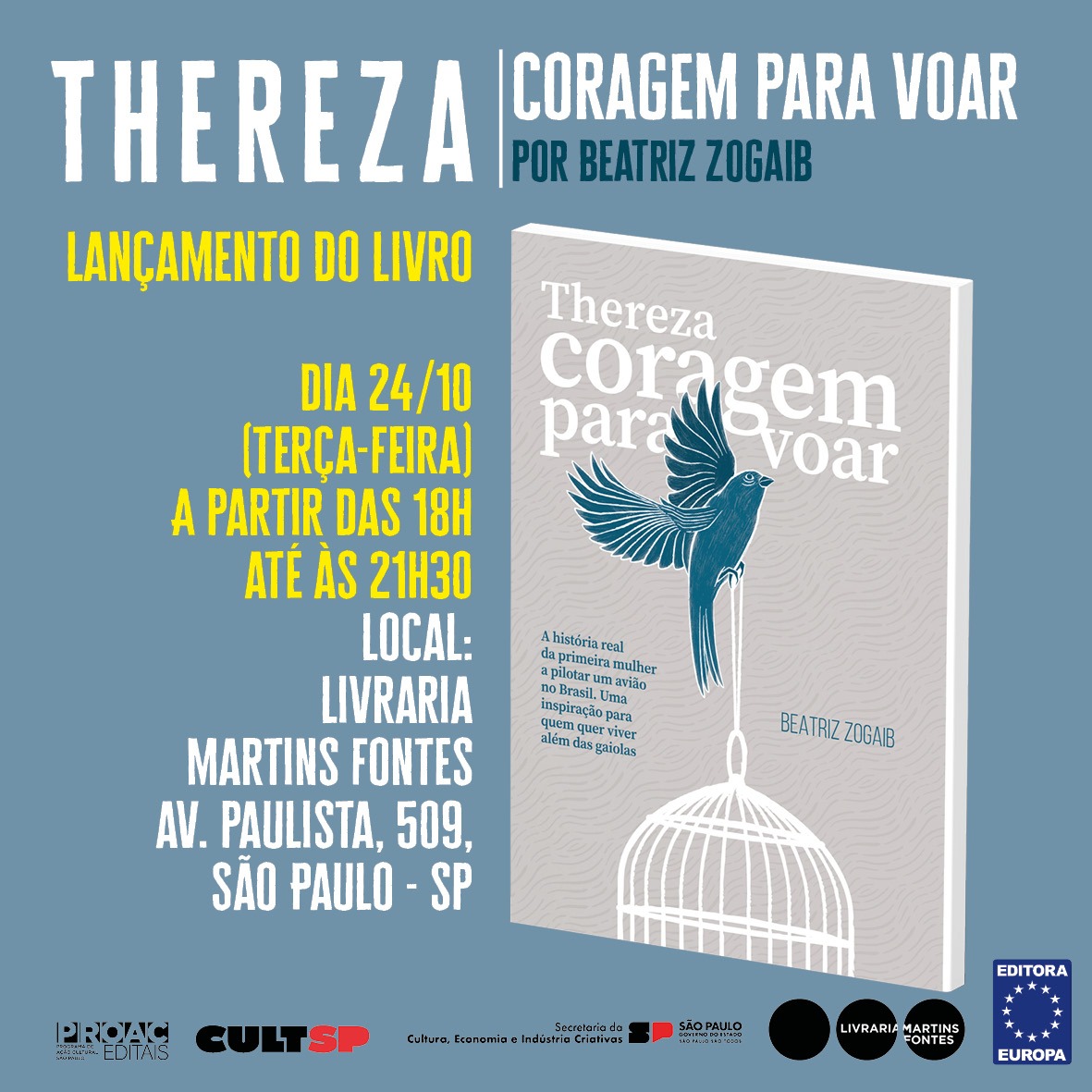 24 de outubro de 2023: nasce Thereza, coragem para voar, de uma atitude também muito corajosa de sua sobrinha-bisneta, Beatriz Zogaib, que decidiu mergulhar de cabeça na vida de uma mulher cheia de história. Bia, como gosta de ser chamada, reuniu todo seu talento de jornalista e especialista em storytelling e nos presenteia com uma biografia emocionante que resgata a importância da história de uma mulher que estava esquecida – como tantas que sabemos que um dia estiveram ou que ainda estão.