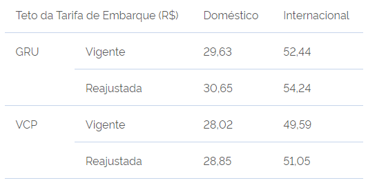 Com a alteração dos valores, a tarifa máxima de embarque doméstico paga pelos passageiros passará de R$ 29,63 para R$ 30,65 no Aeroporto de Guarulhos e de R$ 28,02 para R$ 28,85 no de Viracopos. Por sua vez, a tarifa máxima de embarque internacional passará de R$ 52,44 para R$ 54,24 no Aeroporto de Guarulhos e de R$ 49,59 para R$ 51,05 no Aeroporto de Viracopos. Veja, a seguir, a tabela com os valores vigentes e os reajustados: