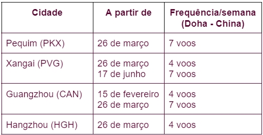 Abaixo a tabela com a nova frequência de voos para a China e suas respectivas cidades**: