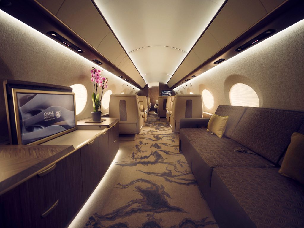 As cabines personalizadas foram projetadas e elaboradas meticulosamente para atender aos padrões dos clientes mais exigentes da Qatar Executive, incluindo um sistema de iluminação revolucionário, a altitude de pressão de cabine mais baixa do setor e iluminação natural através de 20 janelas.