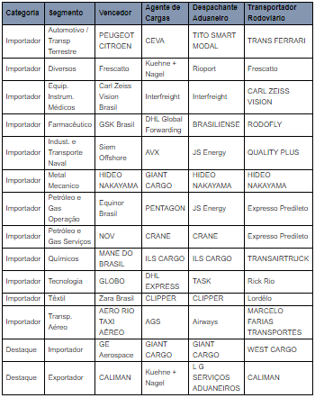 A premiação contemplou diversos segmentos de mercado, entre eles: Automotivo, Transporte Terrestre, Instrumentos e Equipamentos Médicos, Farmacêutico, Metal Mecânico, e Petróleo & Gás (operações e serviços). Assim como na última edição, o PEL 2023 também premiou seis destaques nas categorias: Melhor Companhia Aérea, Importador e Exportador, Agente de Cargas, Despachante Aduaneiro e Transportador Rodoviário.