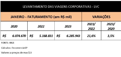 O Levantamento de Viagens Corporativas (LVC), criado pela FecomercioSP em parceria com a Associação Latino Americana de Gestão de Eventos e Viagens Corporativas (ALAGEV), demonstra que em janeiro de 2023 as despesas estimadas das empresas com viagens de negócios atingiram R$ 6,3 bilhões, alta de 21,6% na comparação com o mesmo período do ano anterior. Em termos monetários, significa um crescimento de R$ 1,1 bilhão.