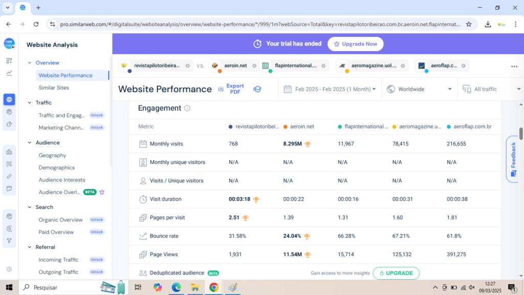 O site da revista Piloto Ribeirão consolida no Brasil sua posição como a principal referência para entusiastas de aviação e turismo, destacando-se não apenas pela qualidade do conteúdo, mas também pelo tempo de permanência e engajamento dos leitores. Dados do SimilarWeb revelam que o Piloto Ribeirão ostenta um tempo médio de visita de 3 minutos e 18 segundos, superando significativamente seus concorrentes, que não ultrapassam a marca de 1 minuto.
