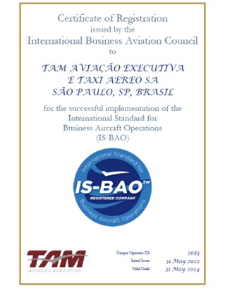 A TAM Aviação Executiva anuncia a conquista da certificação internacional IS-BAO (International Standard for Business Aircraft Operations), que é concedida .