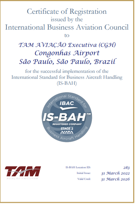 A TAM Aviação Executiva acaba de se tornar a primeira empresa do país a obter o estágio 2 da certificação internacional IS-BAH™, que é concedida pelo International Business Aviation Council (IBAC). A IS-BAH™ engloba um conjunto de melhores práticas globais da indústria e existe para aumentar a segurança e a eficiência de operadores terrestres de aviação executiva (FBO) em todo o mundo.