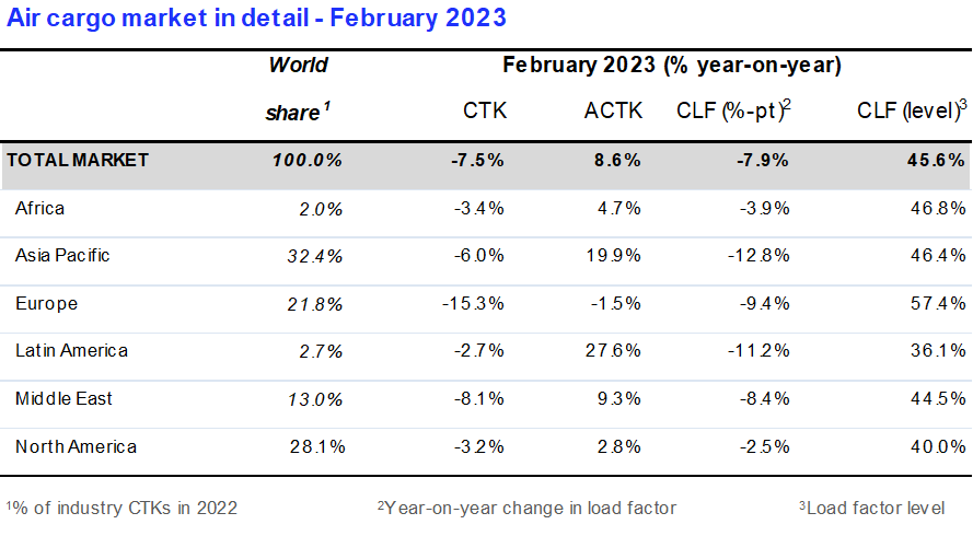 As transportadoras da Europa apresentaram o pior desempenho entre todas as regiões, com queda de 15,3% nos volumes de carga em fevereiro de 2023 em comparação com o mesmo mês de 2022. Mesmo com esse resultado, essa foi uma melhoria no desempenho em relação a janeiro, quando foi registrada queda de 20,4%. As companhias aéreas da região são as mais afetadas pela guerra na Ucrânia. A capacidade diminuiu 1,5% em fevereiro de 2023 em comparação com fevereiro de 2022.