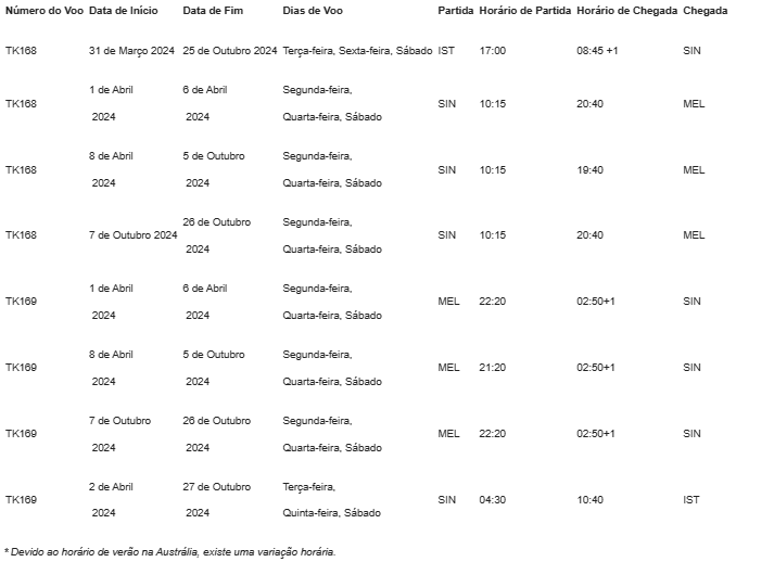 Detalhes do horário de verão para os voos Melbourne/Austrália: