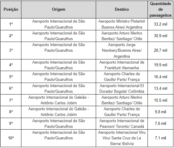 No caso dos destinos internacionais, o que aparece na primeira posição é a rota entre o aeroporto de Guarulhos (SP) e ministro Piristrani, em Buenos Aires, na Argentina, com 33,2 mil passageiros transportados. No segundo lugar aparece o trecho entre Guarulhos e Arturo Benitez, em Santiago, no Chile, com 30,9 mil passageiros. Na sequência vem a rota Guarulhos e Jorge Newbery, em Buenos Aires, na Argentina, com 28,7 mil passageiros. No quarto lugar é a rota entre Guarulhos e Frankfurt, na Alemanha, com 19,9 mil passageiros. E, na quinta posição, a rota de Guarulhos ao aeroporto Charles de Gaulle, em Paris, na França, com 16,4 mil passageiros.
