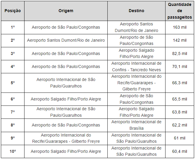 As tradicionais férias escolares de julho costumam impactar no aumento do número de passageiros que circulam pelos aeroportos brasileiros. Segundo levantamento da AirHelp, líder mundial na defesa dos direitos dos passageiros de companhias aéreas e que já ajudou 1,5 milhão de pessoas a receberem indenizações, a rota entre os aeroportos de Congonhas (SP) e Santos Dumont (RJ) foi a mais movimentada em julho de 2022, com cerca de 163 mil passageiros transportados. Em segundo lugar aparece novamente a ponte aérea, só que desta vez no sentido contrário (Santos Dumont para Congonhas), com 142 mil passageiros. Na terceira posição vem o trecho entre os aeroportos de Congonhas e Salgado Filho, em Porto Alegre (RS), com 82,5 mil passageiros. Em quarto lugar aparece a rota de Congonhas com destino ao aeroporto Tancredo Neves, em Belo Horizonte (MG), com 70,1 mil passageiros. E no quinto lugar está o trecho que compreende os aeroportos de Guarulhos (SP) e Guararapes (PE), com 66,3 mil passageiros.