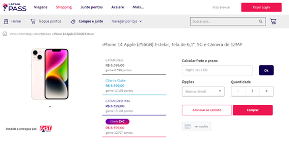 Celulares foram os produtos mais comprados com dinheiro no Shopping LATAM Pass no primeiro trimestre de 2023. No marketplace, é possível adquirir atualmente um iPhone 14 (256GB) Estelar por R$ 6.599,00 e acumular de 6.599 a 13.198 pontos caso a compra seja realizada com o cartão co-branded da parceria entre LATAM Pass e Itáu ou o cliente seja assinante do Clube LATAM Pass. Com esta recompensa em pontos, por exemplo, é possível resgatar uma passagem aérea para voar entre Rio de Janeiro/Galeão e Recife em agosto deste ano.