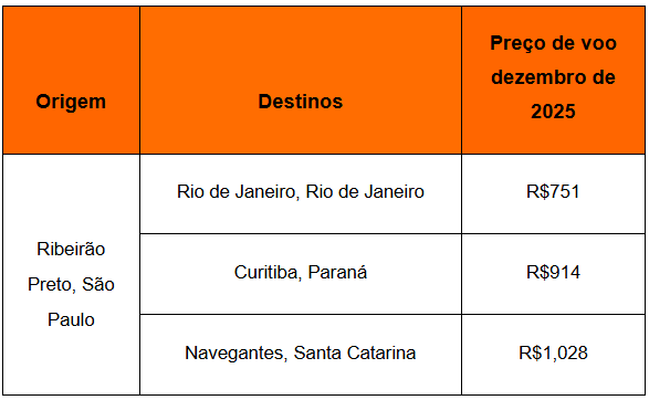 Algumas das rotas mais econômicas no KAYAK para voos de ida e volta em classe econômica, partindo de Ribeirão Preto, em dezembro: