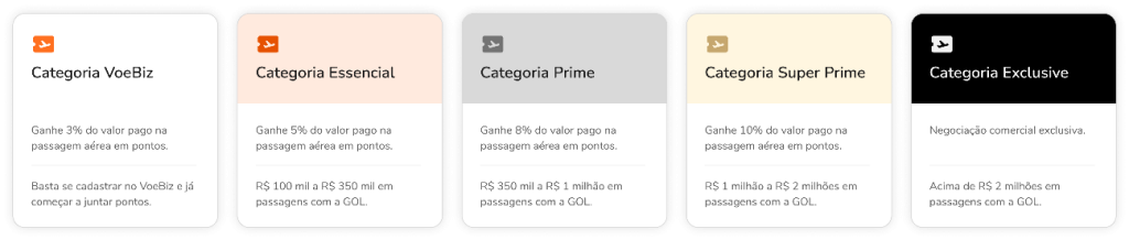 De agora em diante, a empresa cadastrada no VoeBiz junta pontos conforme o valor pago na passagem aérea e de acordo com sua categoria no programa. Cada uma das 5 categorias atuais traz como benefício uma porcentagem diferente do valor pago no bilhete, que é convertido em pontos: 3%, 5%, 8% e 10%. Com essa mudança, ficou ainda mais descomplicado calcular quanto a empresa irá juntar por viagem. A quinta categoria, Exclusive, é especial para empresas que possuem acordo comercial com a GOL.