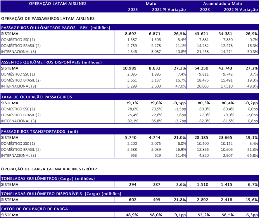 Em maio de 2023, a demanda de passageiros (medida em RPK¹) de todo o grupo LATAM teve crescimento de 26,5% na comparação com o mesmo mês de 2022. No mesmo período, a companhia promoveu o aumento de 27,3% na sua oferta de assentos (medida em ASK²). Como resultado, registrou um recuo de 0,5 pontos percentuais em sua taxa média de ocupação, para 79,1%. Na operação cargueira, a empresa ampliou em 21,8% a sua capacidade (medida em ATK³) em relação a maio de 2022. Confira os resultados completos abaixo: