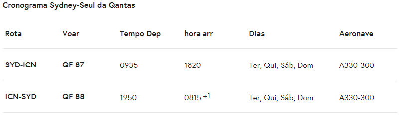 Os voos de 11 horas da Qantas para Seul operarão quatro dias por semana durante o pico da temporada de verão com uma aeronave Airbus A330. Os voos serão operados três vezes por semana entre maio e outubro.