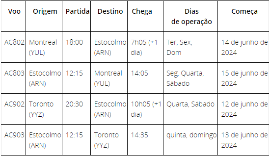 A Air Canada anunciou hoje a expansão estratégica de sua presença na Escandinávia com novos voos sazonais de verão para Estocolmo . Três voos semanais de Montreal e dois voos semanais de Toronto começarão em 12 de junho de 2024 . A companhia aérea também aumentará a capacidade em seus voosanuais para Copenhague saindo de Toronto , com voos diários começando em 1º de maio de 2024 até 31 de outubro , e retomará os voos sazonais de Montreal no início de 2 de maio de 2024 , aumentando para cinco voos semanais em Junho. Os assentos estão disponíveis para compra agora em aircanada.com , por meio do aplicativo da Air Canada, dos centros de contato da Air Canada e dos agentes de viagens.
