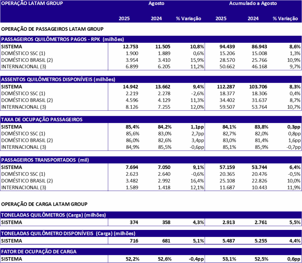 O Grupo LATAM alcançou ainda um crescimento de 9,4% na oferta total de assentos (ASK²), em agosto, em relação ao mesmo mês de 2024. No período, cerca de 7,7 milhões de passageiros foram transportados. Somente no Brasil, foram transportados 3,4 milhões de passageiros pela companhia.