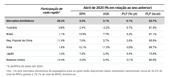 As viagens aéreas domésticas registraram aumento de 3,3% em relação a abril de 2024 e taxa de ocupação de 82,7% (aumento de apenas 0,1 ponto percentual), impulsionado pela expansão de 3,1% da capacidade. O tráfego doméstico nos Estados Unidos foi o único a apresentar contração (-0,5%) pelo terceiro mês consecutivo, enquanto a Índia e o Brasil expandiram a um ritmo de dois dígitos. A expansão da capacidade da Índia foi ainda maior, causando uma ligeira queda na taxa de ocupação, mas seu PLF ainda é o maior entre os principais mercados domésticos.