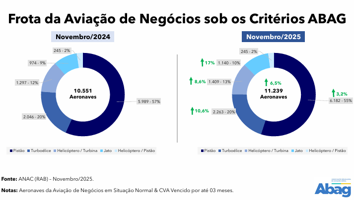 A Associação Brasileira de Aviação Geral (Abag) divulgou novos números sobre a frota de aviação executiva no Brasil, que confirmam a trajetória de crescimento do setor. Em novembro de 2025, o país contabilizou 11.239 aeronaves, ante 10.551 em novembro de 2024, o que representa um aumento de 6,5%.