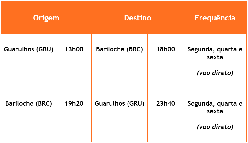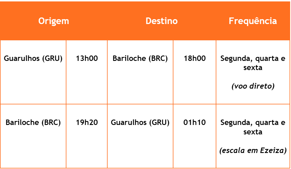 Entre os dias 2 e 7 de julho, as saídas de GRU para BRC são diretas, enquanto a volta de BRC para o Brasil tem uma escala no aeroporto de Ezeiza (EZE). De 9 de julho a 22 de agosto, as operações são sempre diretas, tanto a ida quanto a volta. Entre os dias 25 e 29 de agosto, as decolagens a partir de GRU fazem escala em Ezeiza, ao passo que a volta do destino de inverno acontece sem paradas (veja tabelas abaixo com frequências e horários).
