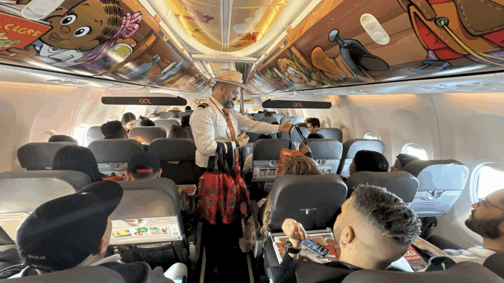 Já dentro da aeronave, os passageiros receberam um serviço de bordo especial com bananinha e goiabinha da Doces Brasil Caipira; além de um kit de produtos com agil-C kids, da Pharmalab; óleo essencial da Thérapi e claro, muitos gibis da turma do Chico Bento, da Panini. Com muito bom humor, a tripulação ainda realizou a entrega de livros e itens escolares como lápis e canetinha para todas as crianças a bordo.