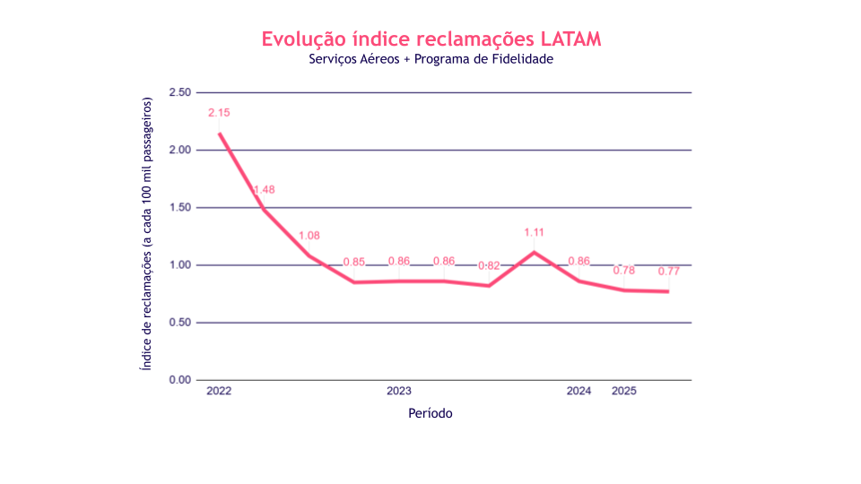 A LATAM reduziu em 64% sua taxa de reclamações no Brasil nos últimos três anos. Segundo dados do consumidor.gov.br, plataforma oficial de atendimento do governo federal, a companhia foi a aérea menos reclamada do país no primeiro semestre de 2025, com 0,77 reclamação a cada 100 mil passageiros transportados. O índice considera as ocorrências relacionadas ao transporte aéreo de passageiros e ao programa LATAM Pass.