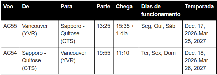Os voos partirão do Aeroporto Internacional de Vancouver (YVR) para o Aeroporto Chitose Hokkaido de Sapporo (CTS) a bordo do Boeing 787 Dreamliner da Air Canada, com opções de Classe Signature, Classe Econômica Premium e Classe Econômica, três vezes por semana, de dezembro de 2026 a março de 2027. Confira as tarifas para o nosso mais novo destino no Japão aqui . As passagens já estão disponíveis para compra em aircanada.com, por meio de agentes de viagens e nas Centrais de Atendimento da Air Canada.