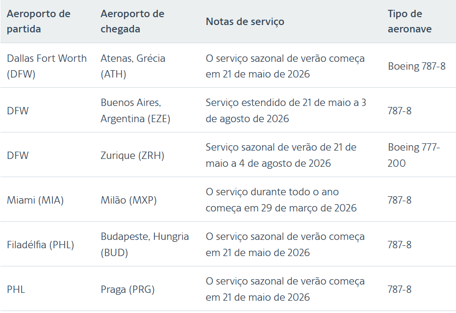 Os bilhetes estarão disponíveis para compra nessas rotas do verão de 2026 a partir de 11 de agosto em aa.com ou pelo aplicativo móvel da American.