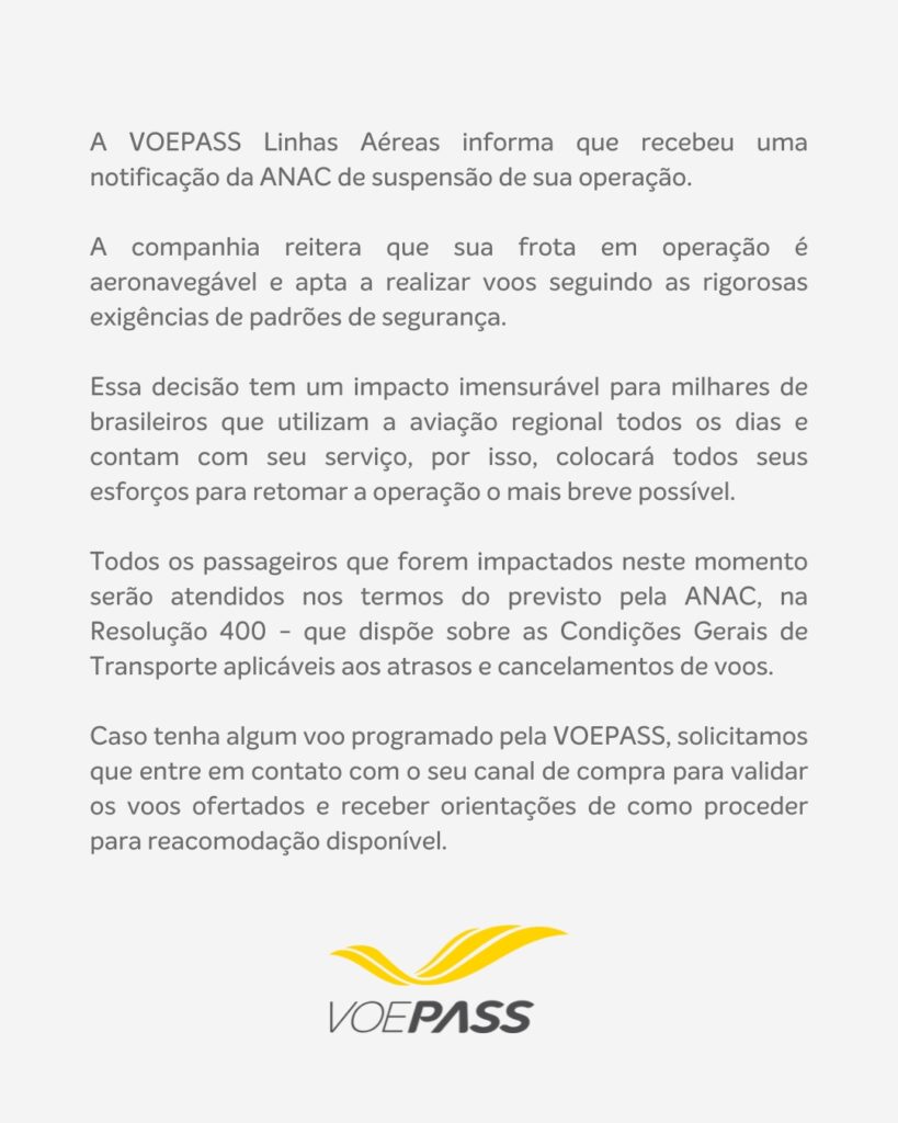 A suspensão das operações aéreas da Voepass significa que a empresa não tem mais autorização da Anac para operar voos no Brasil nem vender passagens aéreas. Como consequência, os voos que estavam previstos não serão mais realizados pela empresa.