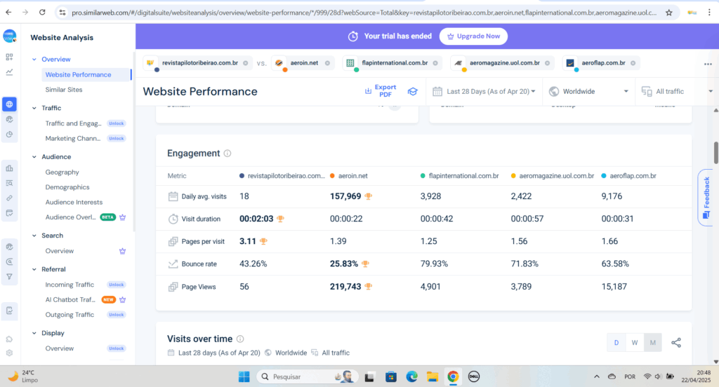 A Revista Piloto Ribeirão acaba de alçar voo ainda mais alto, conquistando um novo e impressionante recorde de audiência no competitivo cenário online da aviação e do turismo brasileiro. Os mais recentes dados do SimilarWeb revelam que o site da revista não apenas ultrapassou a marca de 3.11 páginas visualizadas por sessão, como também registrou um tempo médio de permanência dos leitores superior a 2 minutos e 03 segundos. Este feito notável solidifica ainda mais a liderança incontestável da Piloto Ribeirão no setor.