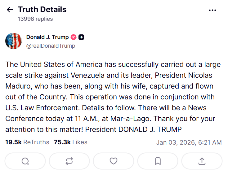 Na madrugada deste sábado (03) os Estados Unidos da América realizou um ataque certeiro em solo Venezuelano, no qual o Presidente americano Donald Trump confirma que o Ditador e Narcotraficante Nicolas Maduro e sua esposa Cilia Flores foram capturados, e já se encontram em solo americano para serem julgados pelo crime de narcoterrorismo.