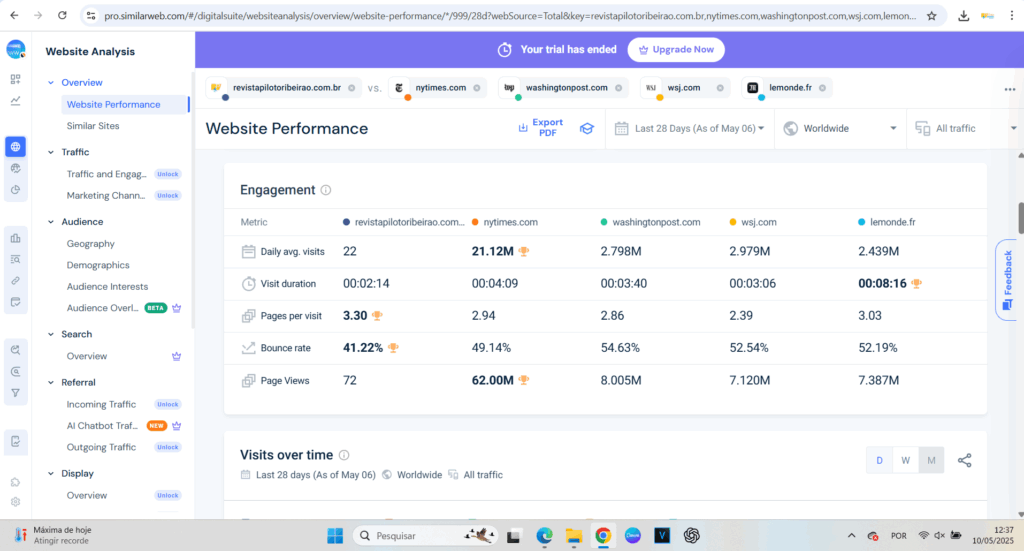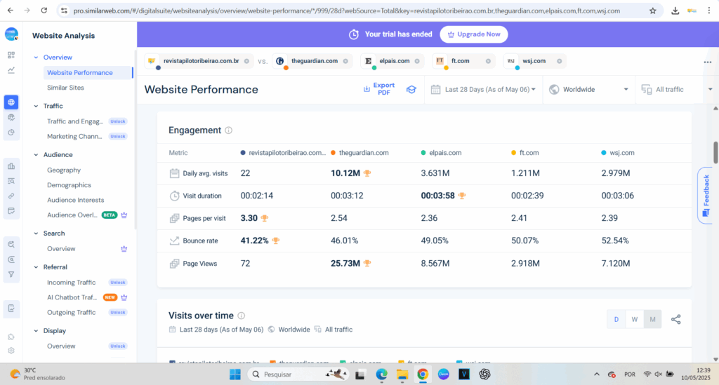 A Revista Piloto Ribeirão acaba de cruzar fronteiras e alçar voo em um patamar nunca antes imaginado! A mais recente análise de dados de engajamento online do site Similarweb revela um feito extraordinário: o site da Piloto Ribeirão não apenas mantém sua liderança incontestável entre os sites de aviação no Brasil como mostrado aqui, mas agora ostenta números de engajamento superiores aos de gigantes da mídia mundial, como The New York Times, The Guardian, El País, The Washington Post, The Wall Street Journal, Financial Times e Le Monde!