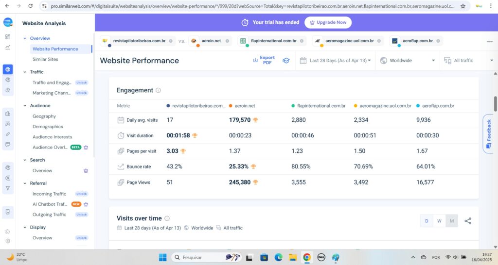 A Revista Piloto Ribeirão acaba de cruzar mais um patamar impressionante, estabelecendo um novo recorde de audiência entre os principais sites de aviação do Brasil. De acordo com os dados mais recentes do SimilarWeb, a plataforma online da revista saltou de 2.99 para 3.03 páginas visitadas por sessão, reforçando sua posição como líder incontestável no dinâmico mercado aeronáutico e turístico nacional.