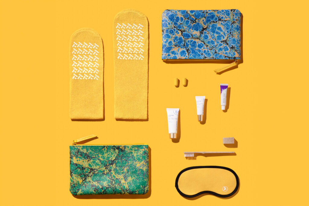 Os kits incluem loção para mãos e corpo, além de bálsamo labial, formulados pela marca de luxo Ex Nihilo, especializada em fragrâncias e bem-estar. Aproximadamente 80% dos materiais utilizados nos itens, como meias, máscaras de dormir e escovas de dentes, são fabricados com opções recicladas ou sustentáveis, incluindo amido de milho biodegradável.