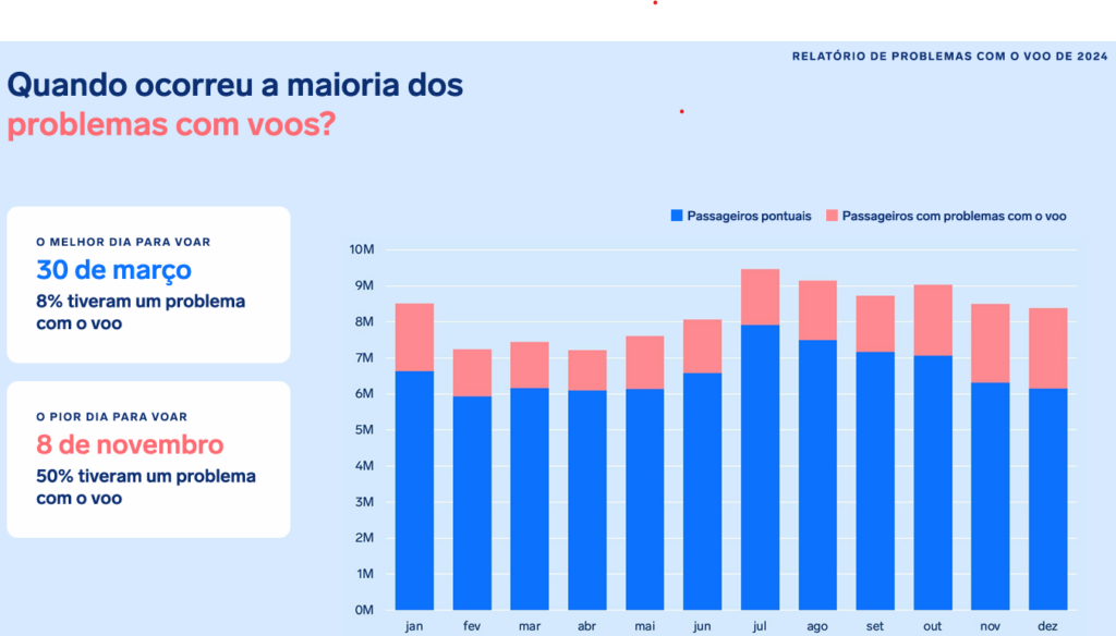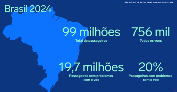 • 1 em cada 19 passageiros é elegível a pleitear compensação financeira às companhias aéreas por problemas em voos em 2024